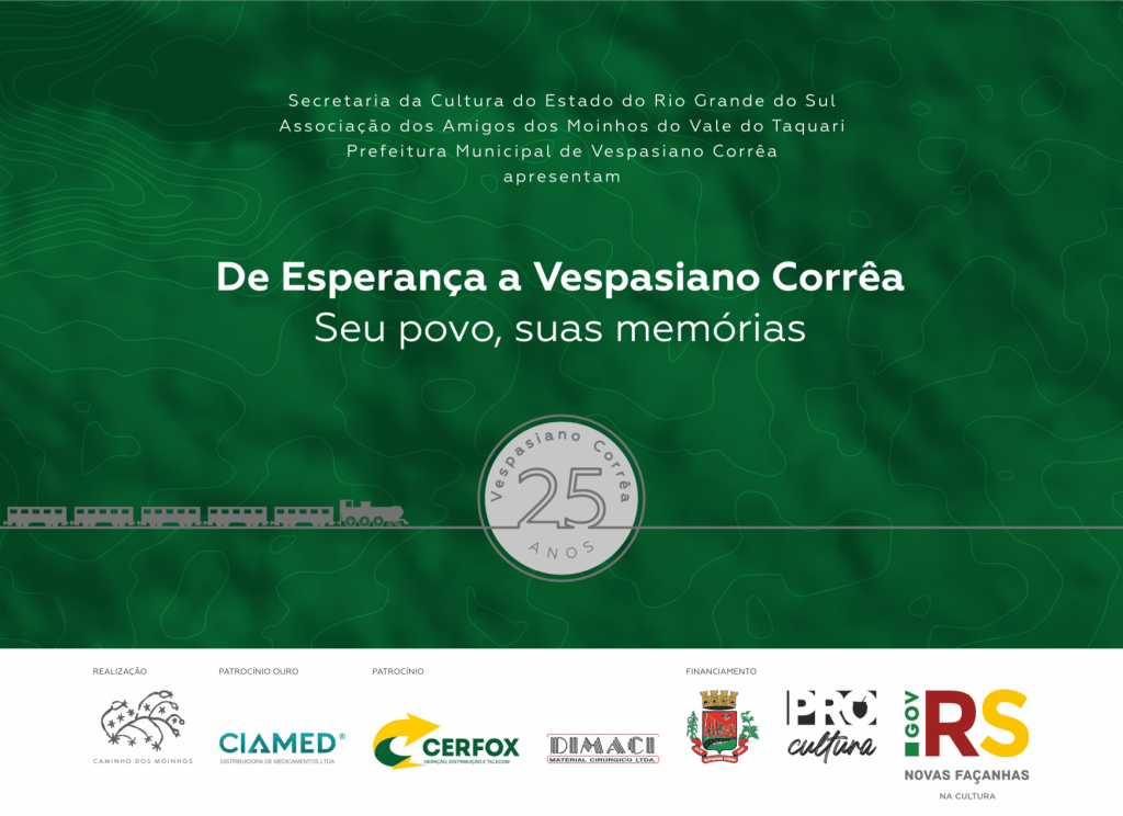 Financiado pelo PRÓ-CULTURA, Governo do Estado do Rio Grande do Sul, por meio da Lei de Incentivo à Cultura – LIC/RS e pela Prefeitura de Vespasiano Corrêa, com patrocínio de Ciamed, Cerfox e Dimaci e realização da Associação dos Amigos dos Moinhos do Vale do Taquari – AAMoinhos, a publicação é resultado de um minucioso trabalho de pesquisa do Centro de Memória, Documentação e Pesquisa da Univates, com autoria dos professores pesquisadores Marcos Rogério Kreutz, Patricia Schneider e coordenação de Neli Teresinha Galarce Machado, além de importante colaboração do comitê municipal de pesquisa e do pesquisador autônomo vespasianense, Cassiano Faggion, bem como da memória afetiva de seus moradores, descendentes de imigrantes italianos, poloneses, franceses e alemães, atualizando o legado histórico e contemporâneo do município, que, ao longo de 2021, comemorou, também, os seus 25 Anos de Emancipação Política.